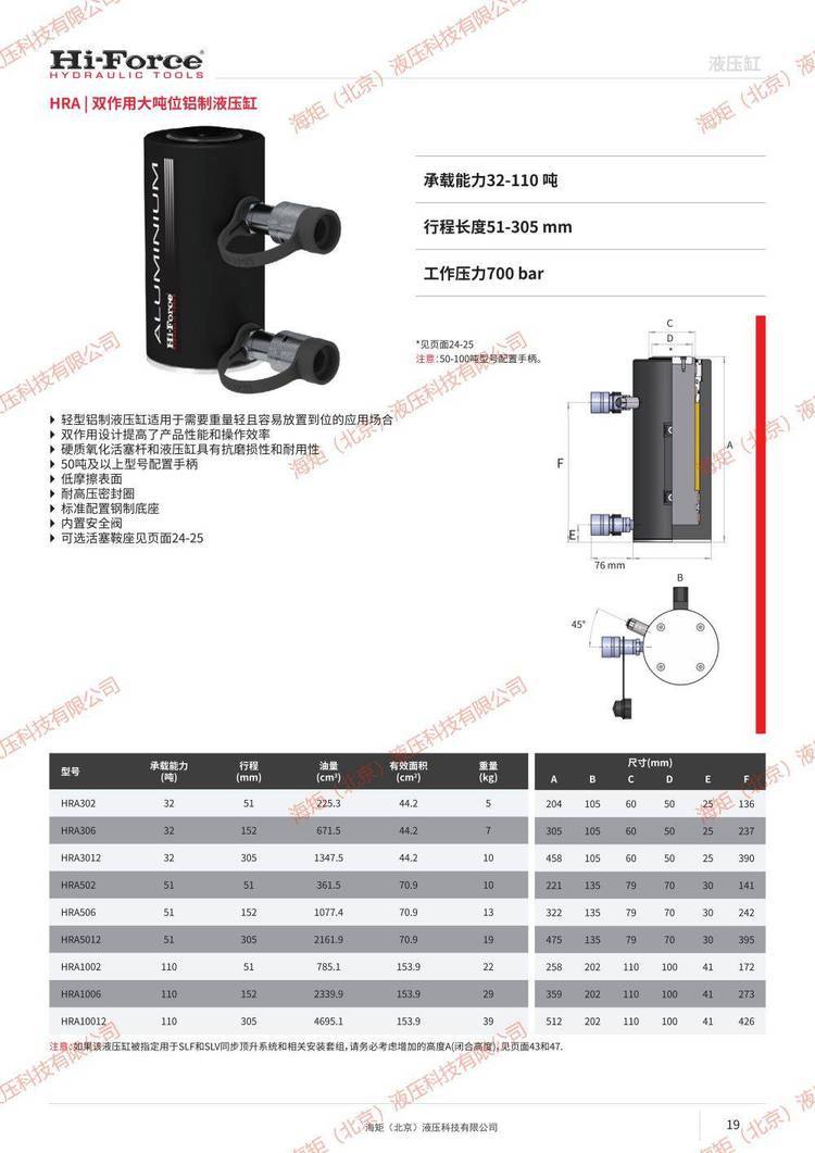 海矩 HFA302单作用自锁铝制液压缸hi-forceHHA504单作用中空液压缸