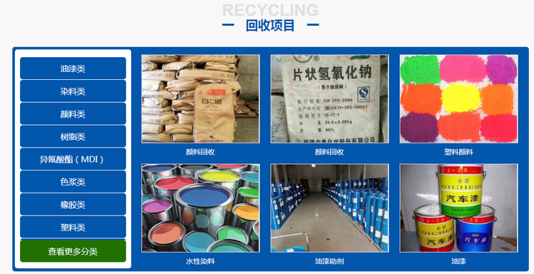 油漆回收、废旧油墨、陶瓷颜料、油墨回收、香精回收、松香树脂、树脂醇酸、回收橡胶、环氧树脂、回收树脂、回收陶瓷、交换树脂、废旧汽车、油漆地区、橡胶助剂、颜料再生、染料墨水、染料回收、库存化工、有机颜料、回收热熔胶、食品添加剂、回收钛白粉、添加剂回收、环氧丙烯酸