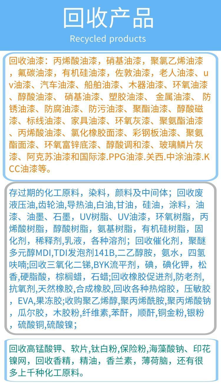 油漆回收、废旧油墨、陶瓷颜料、油墨回收、香精回收、松香树脂、树脂醇酸、回收橡胶、环氧树脂、回收树脂、回收陶瓷、交换树脂、废旧汽车、油漆地区、橡胶助剂、颜料再生、染料墨水、染料回收、库存化工、有机颜料、回收热熔胶、食品添加剂、回收钛白粉、添加剂回收、环氧丙烯酸