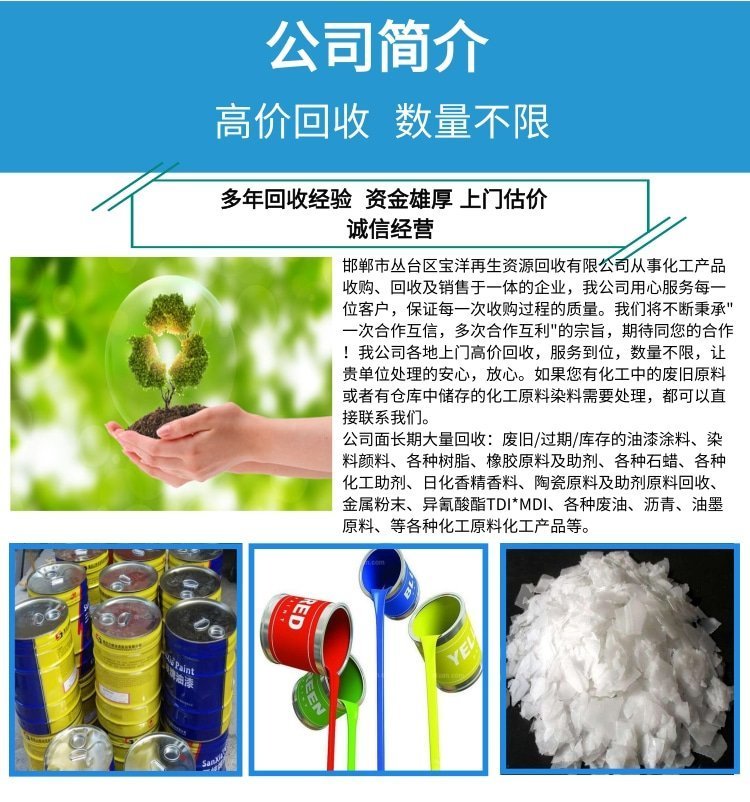 油漆回收、废旧油墨、陶瓷颜料、油墨回收、香精回收、松香树脂、树脂醇酸、回收橡胶、环氧树脂、回收树脂、回收陶瓷、交换树脂、废旧汽车、油漆地区、橡胶助剂、颜料再生、染料墨水、染料回收、库存化工、有机颜料、回收热熔胶、食品添加剂、回收钛白粉、添加剂回收、环氧丙烯酸