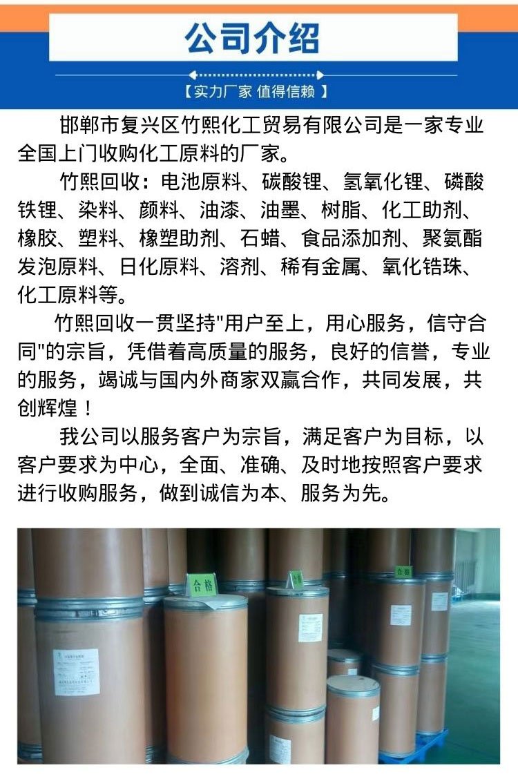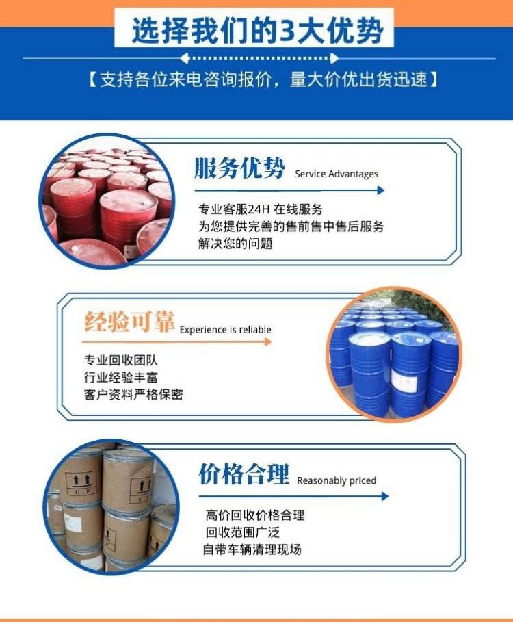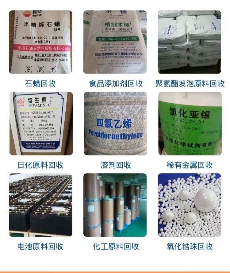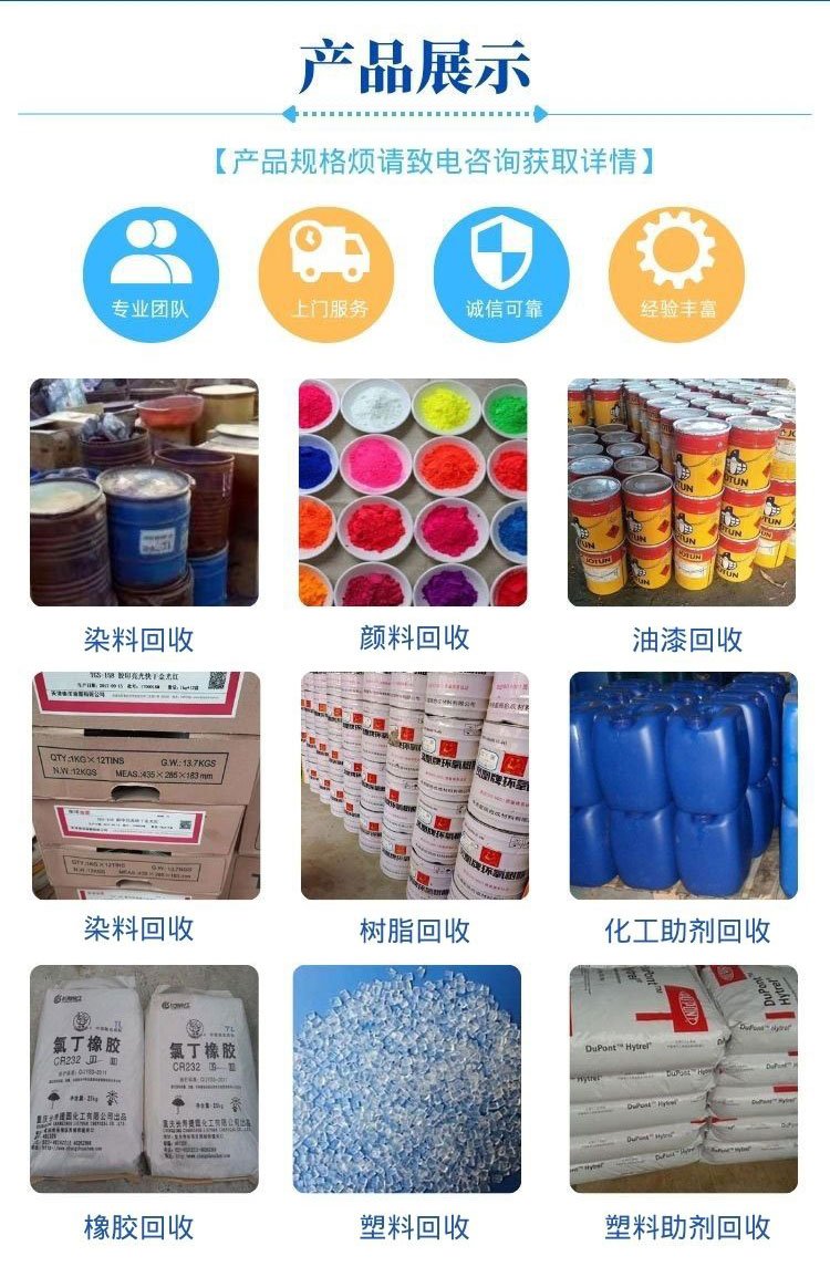 回收油漆、回收导热油、回收日化原料、回收助剂、回收香精、回收颜料、回收氧化锆珠、回收树脂、回收机油、回收油墨、回收橡胶、回收溶剂、回收色浆、回收涂料、回收橡胶助剂、回收染料、回收聚醚、回收磷酸铁锂