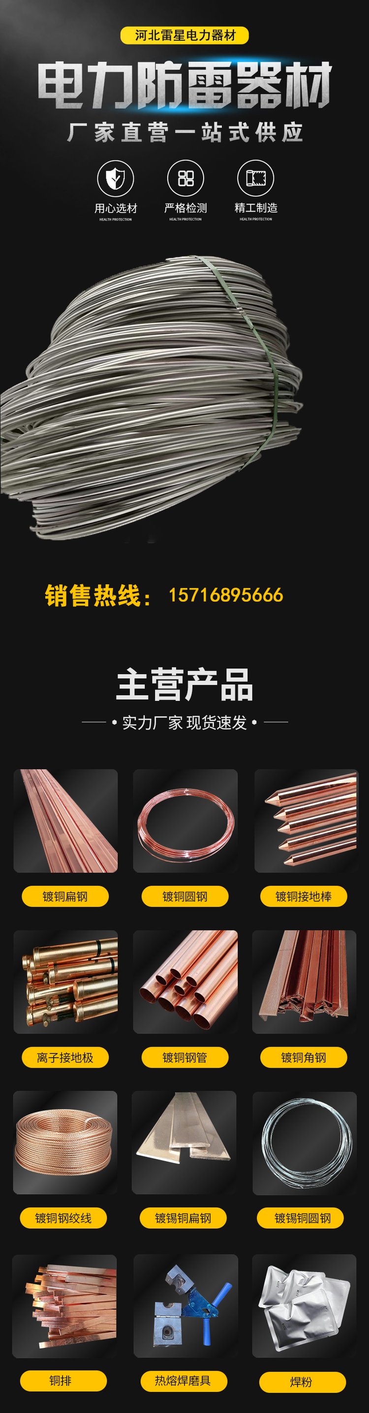铜覆钢扁钢、铜覆圆钢、铜覆钢接地棒、离子接地极、接地引出装置、铜端子、镀铜扁钢、镀铜接地棒、镀铜扁钢、镀铜圆钢、镀锡铜扁钢、镀锡铜圆钢、镀锡铜接地棒、铜覆钢棒、镀铜圆管、热熔焊模具、焊粉、铜排