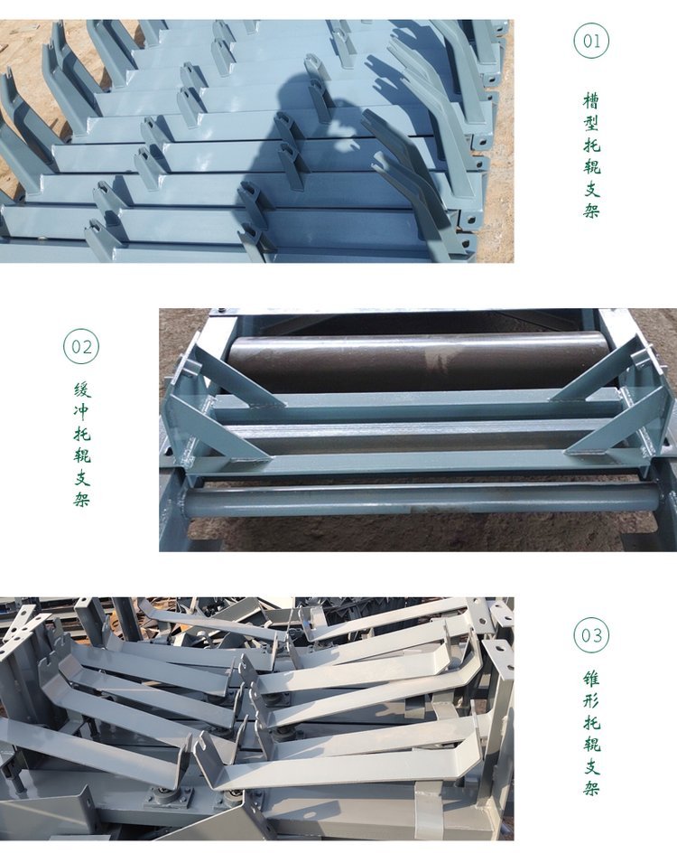 好的托辊支架装置即便于更换托辊的托辊支架装置,涉及有可偏转托辊支架、支座、销轴、机身、托辊、限位块和紧固件组成。支座下端与机身上端用紧固件连接在一起,支座则用销轴与可偏转托辊支架连接在一起,在可偏转托辊支架上设置有托辊。在可偏转托辊支架上,设置有供绕销轴转动的卡槽,托辊则安装在可偏转托辊支架的卡槽中,在可偏转托辊支架上设置有控制偏转角度的限位块。在支座或机身上设置有供可偏转托辊支架绕其转动的销轴,在拆下紧固件的情况下,可偏转托辊支架可以在限位块的控制下绕水平固定的销轴转动一定的角度。 槽型支架属于托辊支架的一种。采用先进的生产工艺,保证产品质量。槽型托辊皮带沾物,在斜坡皮带上送力大,阻力小,效果。双节托辊,能减轻皮带在陶瓷托辊上的重形压力点,托辊中空装置能使带沾物自行掉落,不沾吸托辊,均能延长托辊使用期。