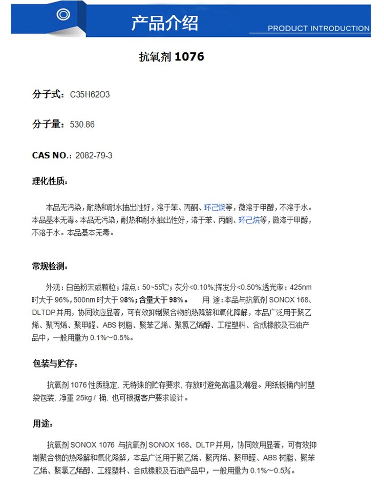 抗氧剂1076 受阻酚类 塑料添加剂 工程塑料 聚烯烃 粘合剂