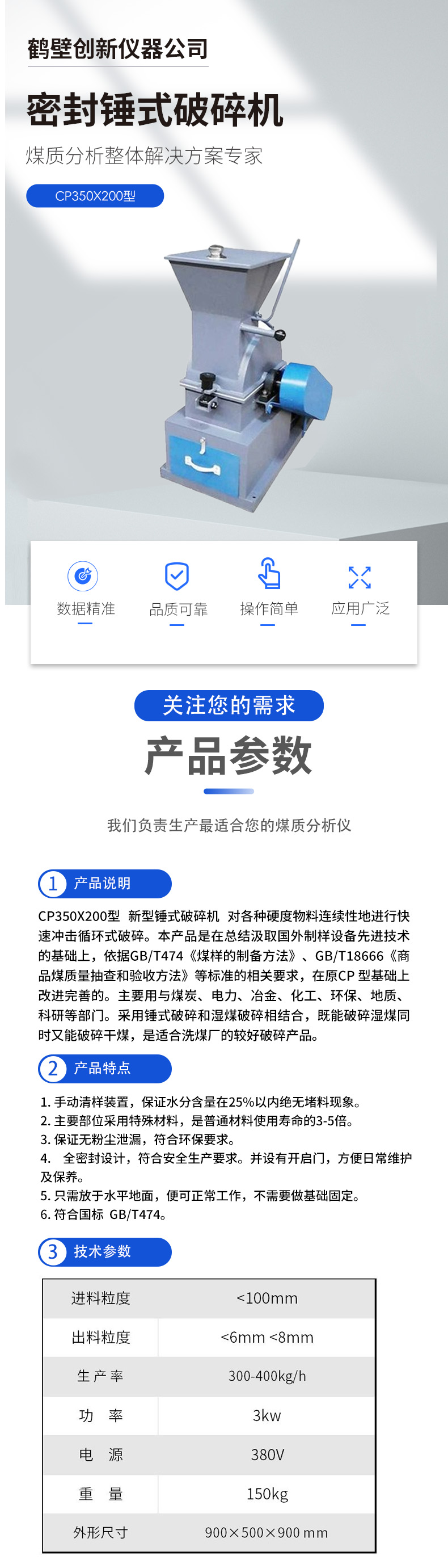 煤炭化验破碎设备 CP350X200 新型锤式破碎机 实验室用锤头式粉碎机