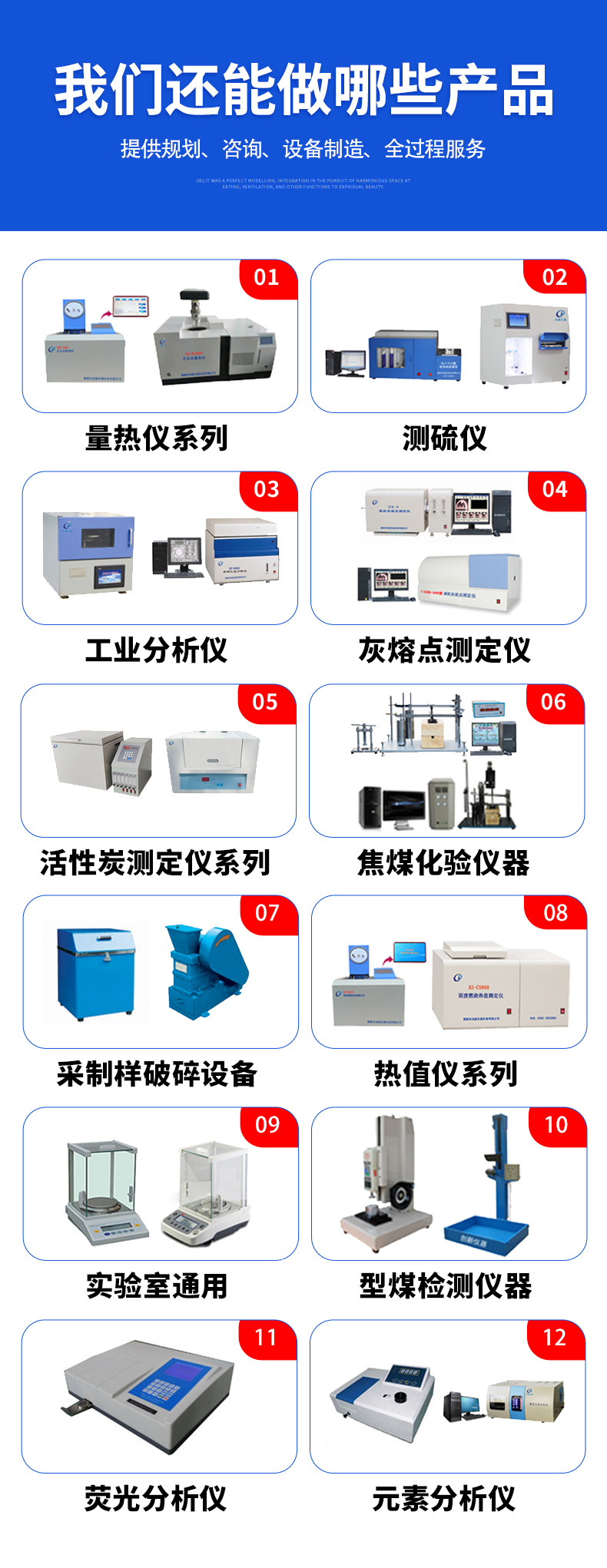 分析仪、取样壶、测氮仪、测硫仪、测氢仪、压片机、测磷仪、定硫仪、硅铝仪、破碎机、量热仪、试验机、实验筛、水分仪、工业分析仪、灰熔点测定仪、全自动量热仪、元素分析仪