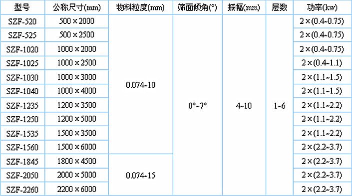 SZF型系列振动筛工作时,两电机同步反向旋转使激振器产生反向激振力,迫使筛体带动筛网做纵向运动,使其上的物料受激振力而周期性向前抛出一个射程,从而完成物料筛分作业.