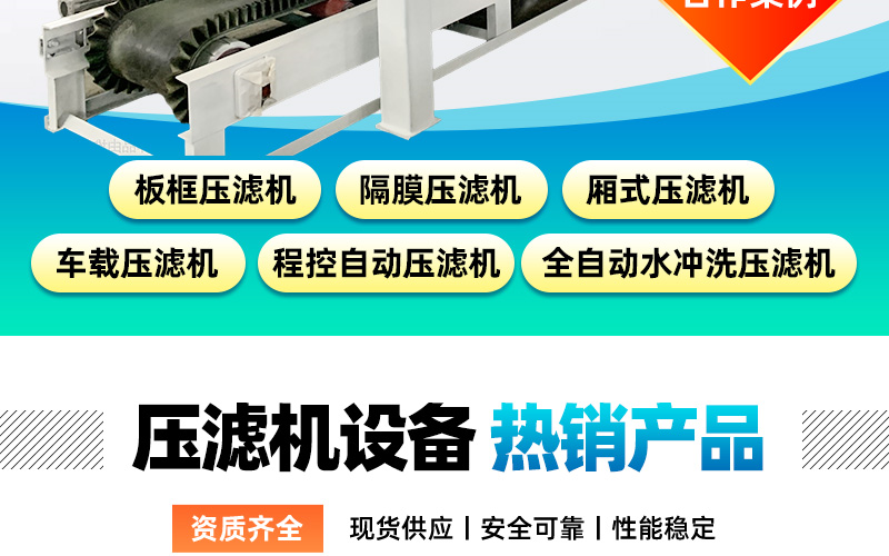 板框式压滤机、隔膜压滤机、厢式压滤机、车载压滤机、移动式压滤机、全自动水冲洗压滤机、程控自动压滤机、泥浆压滤机、污泥压滤机、污泥脱水机