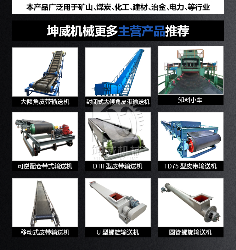 皮带输送机、大倾角皮带输送机、DTII槽型皮带机、封闭式输送机、TD75型皮带输送机、输送机、爬坡输送机、皮带机卸料小车、可逆配仓带式输送机、皮带机、固定式皮带机、U型螺旋输送机、移动式皮带输送机、环保输送设备、LS/GX螺旋输送机、往复式给煤机、管式螺旋输送机、挡边皮带输送机、可逆带式输送机、可逆配仓卸料小车、皮带机配件、筛分设备、叶轮给料机、板式给料机、圆盘给料机