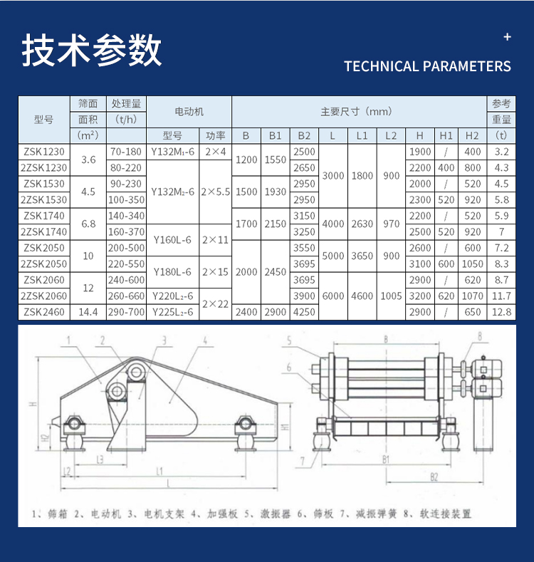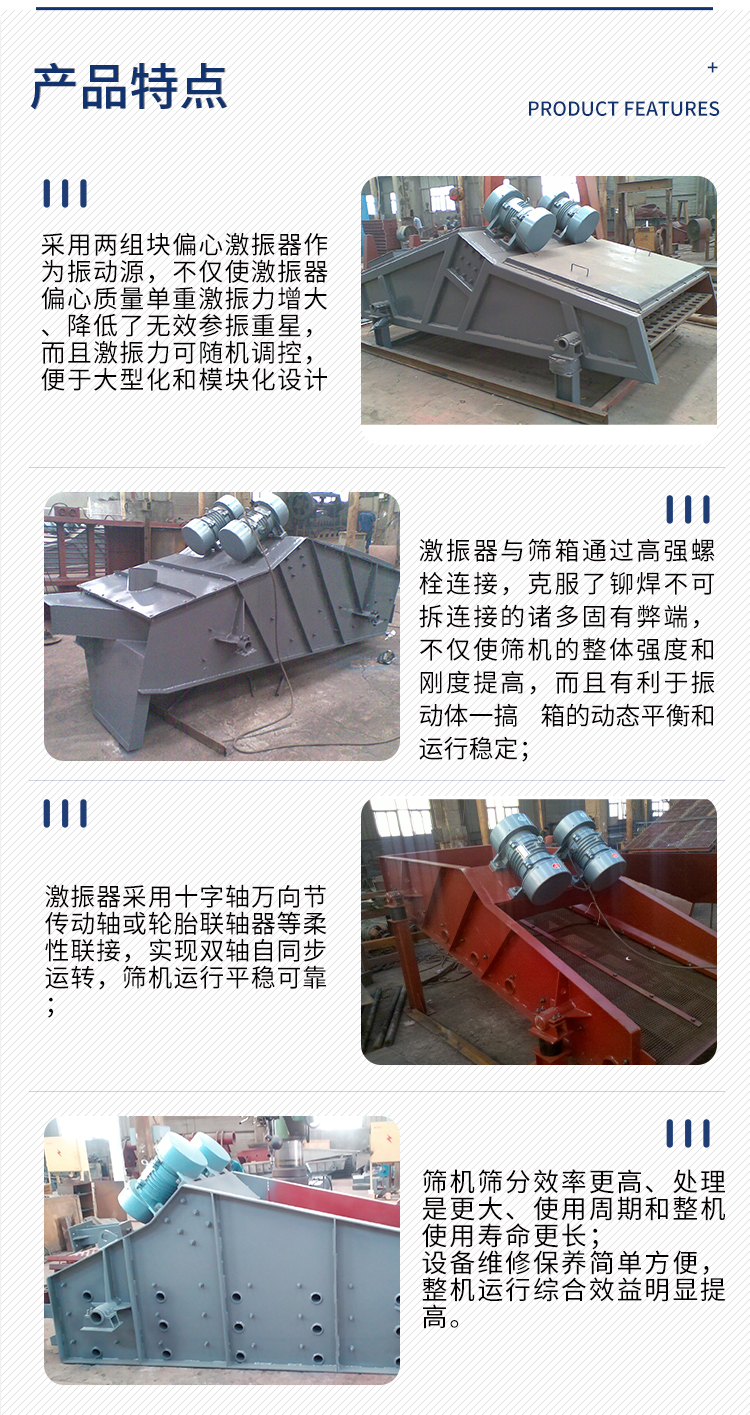 振动电机、超声波筛分机、ZW棒条给料机、电磁振动给料机、GZG电机振动给料机、YK系列圆振动筛、ZKS系列直线振动筛、S49旋振筛、摇摆振动筛、脱水筛、振动料斗、BTS系列热矿振动筛、斗式提升机、XZG型双质体振动给料机、K型往复式给煤机、螺旋输送机、SCG型系长距离高温物料输送机、钢球钢锻挑选机、YA系列圆振动筛、方形摇摆筛