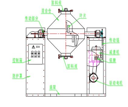 双锥混合机由转桶、设备支架、动力部分组成。