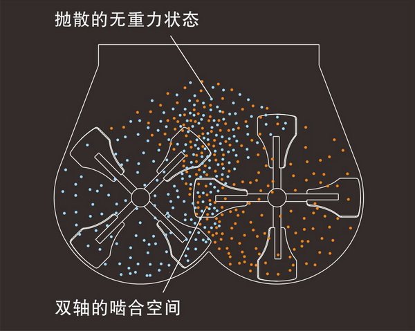 无重力混合机装载着两根同时异向向外旋转的平行桨叶轴,每根轴上搭载十字桨叶,在驱动装置的同步作用下,两根的十字桨叶轴的运行轨迹成相交关系,且错位啮合。驱动装置驱使桨叶轴快速旋转,旋转的桨叶产生离心力,将物料有效抛洒至筒内上空部分,达到抛物线的**点后下落(抛物线的**点也称为瞬间无重力状态),物料再受桨叶的驱赶,在筒体内往复循环混合,并受双轴的啮合空间混合、剪切、分离,致使物料快速混合均匀。