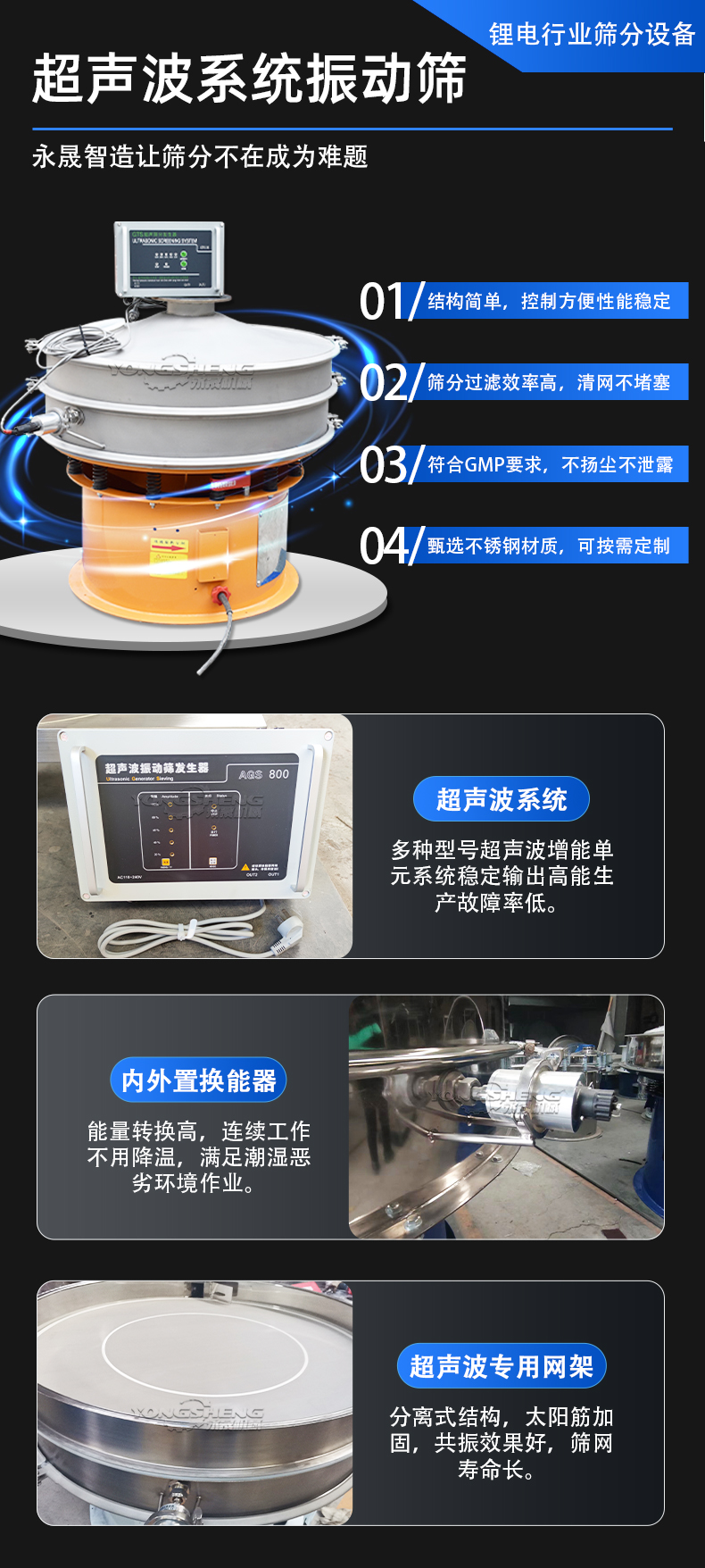 永晟 负极电池筛选机 不锈钢 高频振动 快速筛分 防止堵网 超声波振动筛