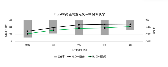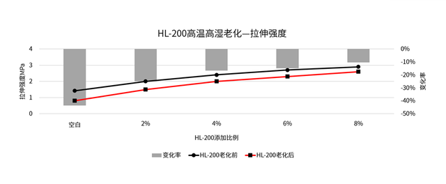 在有机硅胶粘剂中分别添加0%、2%、4%、6%、8%的HL-200,经高速分散后,依据国家标准制备哑铃型试样,进行双85老化测试(85℃/85%RH条件)。在电子万能试验机上进行拉伸测试,得到各添加量下老化前后的拉伸强度及断裂伸长率。