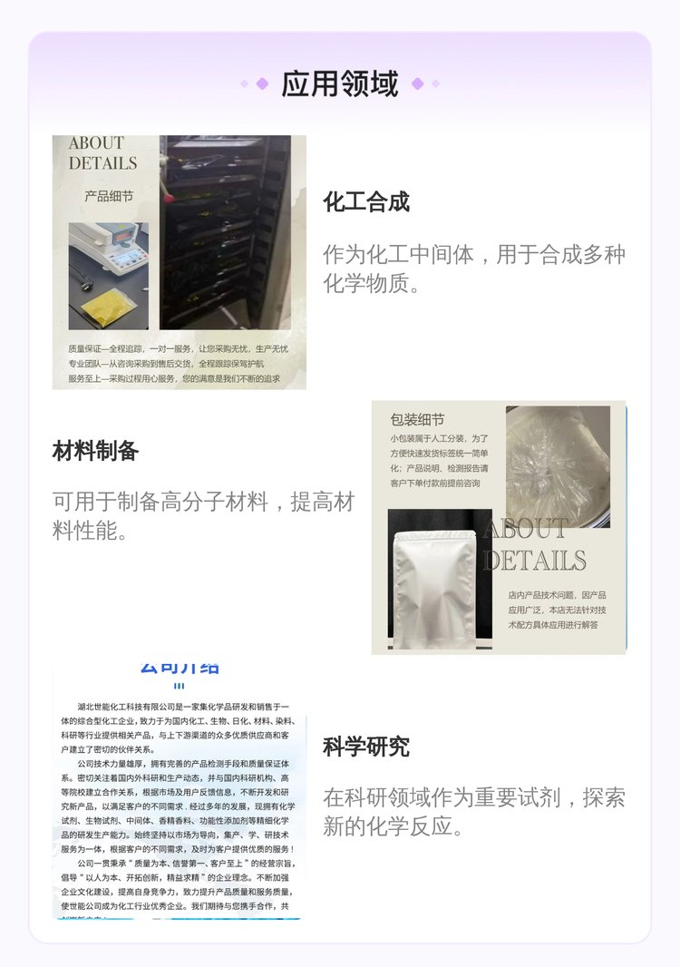 3、5、5-三甲基己醛、正癸酸、樊多B醛、聚乙二醇甲醚甲基丙烯酸酯、山梨醇缩水甘油醚、聚苯胺、磷脂酸铵盐、谷胱甘肽、二氧化钒、三羟甲基氨基甲烷盐酸盐、2、3二羟基萘、二苯酮、庚酰氯、菲尼酮、茶香醇、苹果酸、菠萝醚