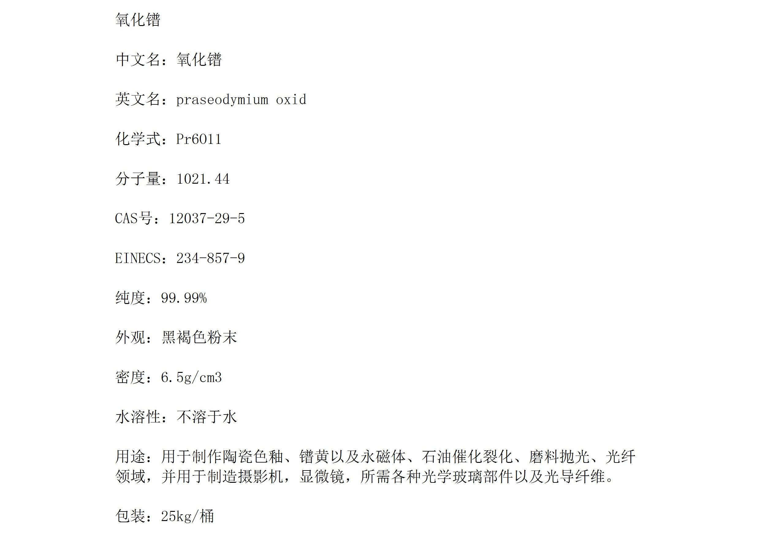 氧化镨 Pr6O11黑褐色粉末 制备光学玻璃部件以及光导纤维
