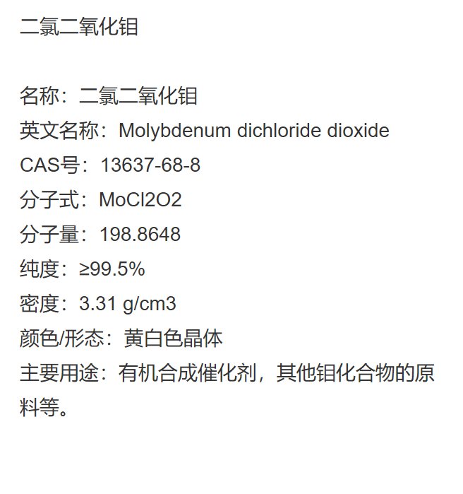 二氯二氧化钼 CAS号:13637-68-8 主要用途:有机合成催化剂