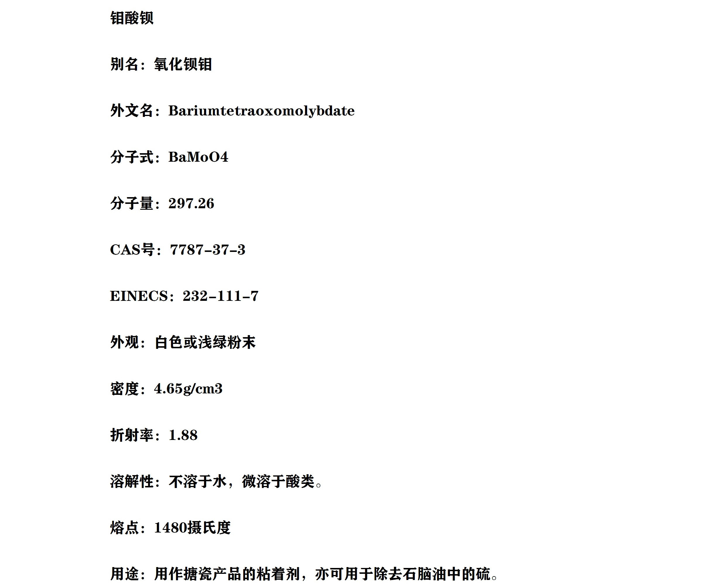 钼酸钡 氧化钡钼 搪瓷产品的粘着剂 有机染料中间体