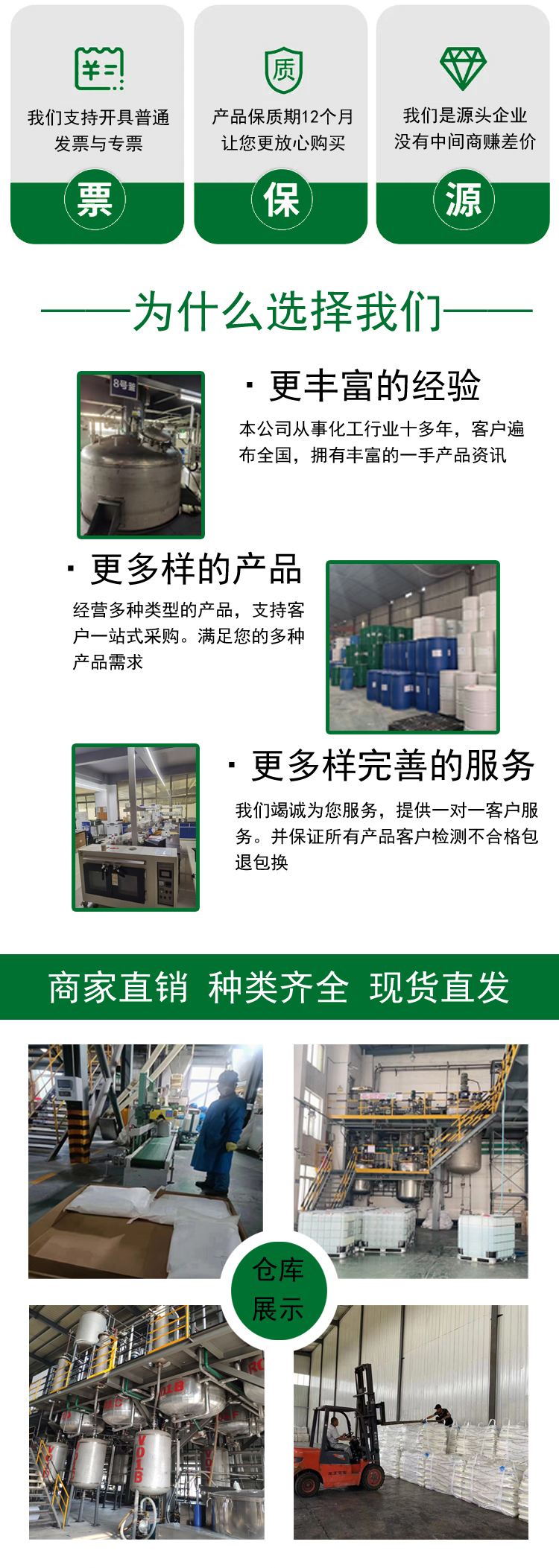 胶合板、环辛醇、甲酸镍、水苏糖、乙酸镉、木香油、西瓜酮、硫酸锌、封口蜡、钒酸铋、溴氨酸、聚合物、草酸钙、溴壬烷、磷酸铬、牛磺酸、丙酸铵、珠光片、磷酸铝、新癸酸、杀螨剂、叶绿素、浮选剂、稀释剂、胡椒碱