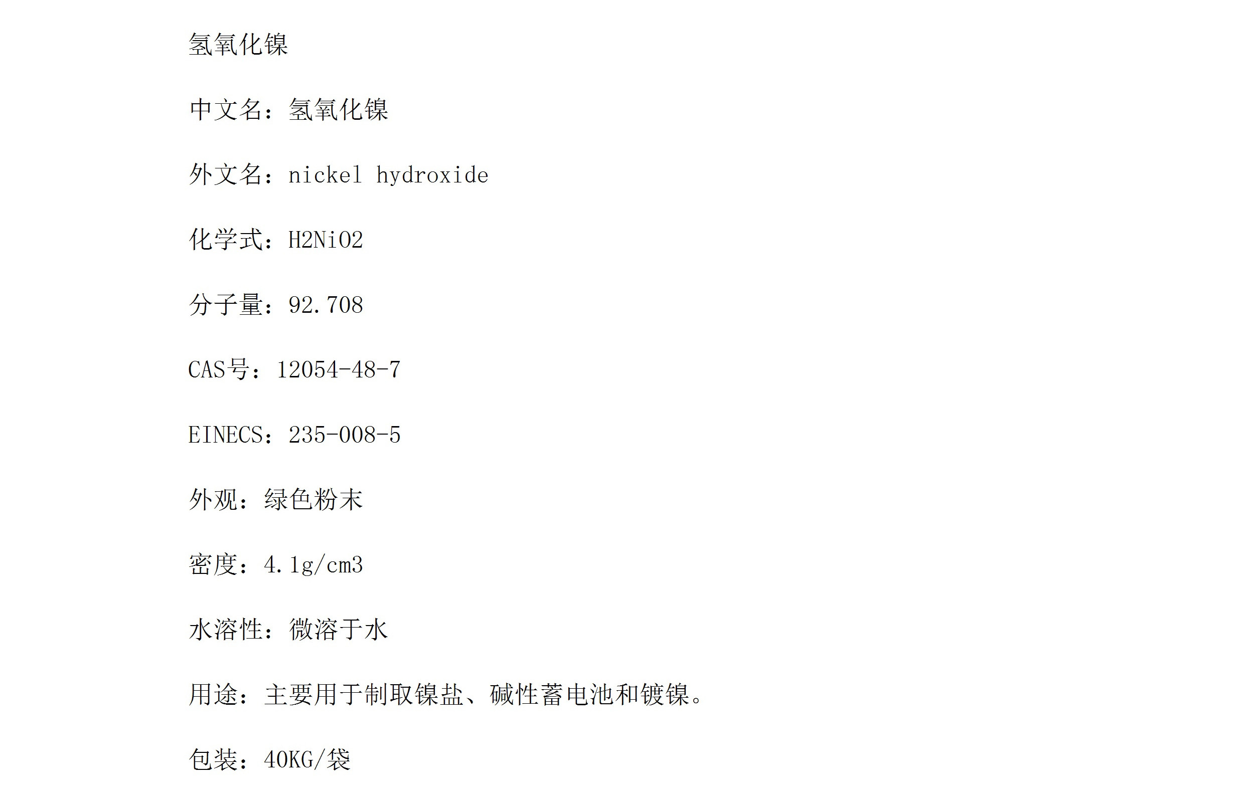 氢氧化镍 H2NiO2绿色粉末 用于碱性蓄电池和镀镍