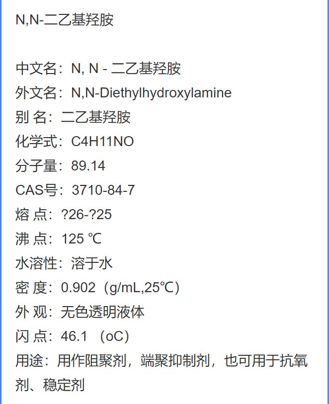 N,N-二乙基羟胺 CAS号:3710-84-7 用作阻聚剂,端聚抑制剂