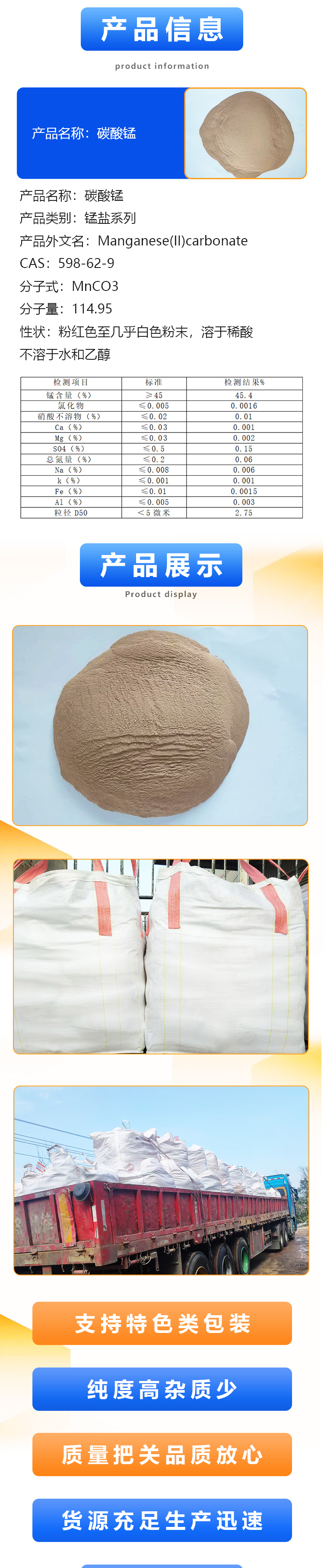碳酸锰 碳酸亚锰 电池级 用作电信器材软磁铁氧体CAS598-62-9