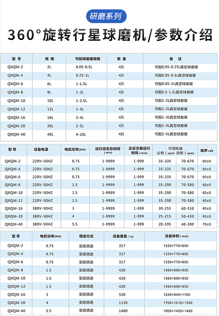 全方位行星球磨机简介:全方位行星球磨机是在立式行星球磨机基础上,增加了行星盘翻转功能,行星盘和球磨罐在做行星运动的同时,又可在一立体空间范围内做360°翻斗式翻转,实现球磨罐多维多向运动,提升磨球及物料无序化运动程度,整个物料在磨罐内360度研磨,使所研磨的物料更加匀细,并能解决部份物料沉底和粘罐问题。