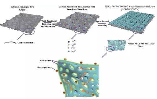混合金属氧化物具有优异的电化学活性,在高性能超级电容电极领域具有广阔的应用前景。然而,电极内离子动力学和电子动力学的迟滞从根本上限制了其电化学性能的进一步提高。为了弥补这一不足,近日,深圳大学朱才镇副教授和于佳立副研究员等人在Science China Materials上发表研究论文,通过原位化学反应在自支撑碳纳米管薄膜(CNTF)表面生长四元过渡金属氧化物纳米片(Ni-Co-Mn-Mo NS),并进一步在纳米片上沉积碳纳米管导电网络(CNTN),得到了具有“三明治”结构的多孔柔性电极薄膜(CNTF/Ni-Co-Mn-Mo NS/CNTN)。