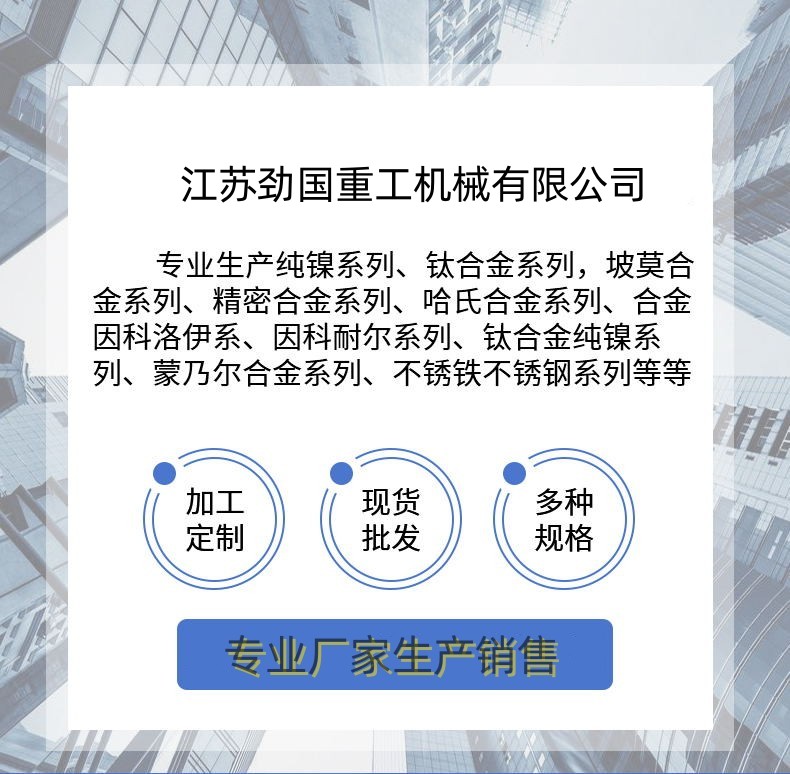 铜镍合金、镍基合金、高温合金、圆钢、无缝管、钢板、钢带、弯头、三通、法兰、抓斗