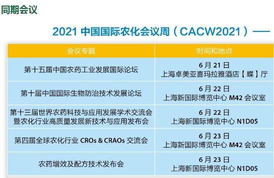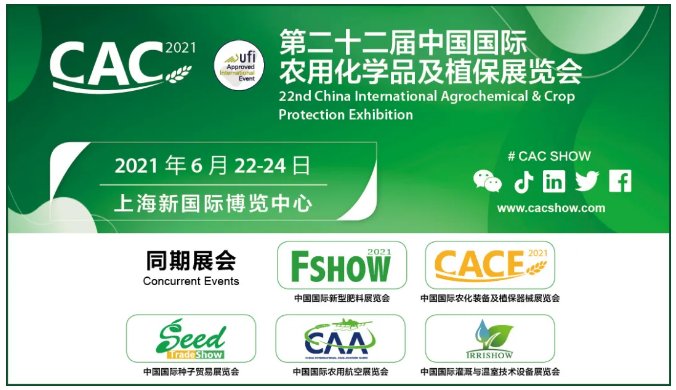 CAC2021为期3天,由中国国际贸易促进委员会化工行业分会主办,农化装备及植保器械展览会(CACE),新型肥料展览会(FSHOW),种子贸易展览会(SeedTradeShow)也同期举行。展览涵盖农用化学品及其生产、加工、分装和施用设备,种子,相关新产品新技术,以及与之配套上下游产业产品,产品的分析、检测、试验、市场分析、拓展咨询等服务机构及相关设备。