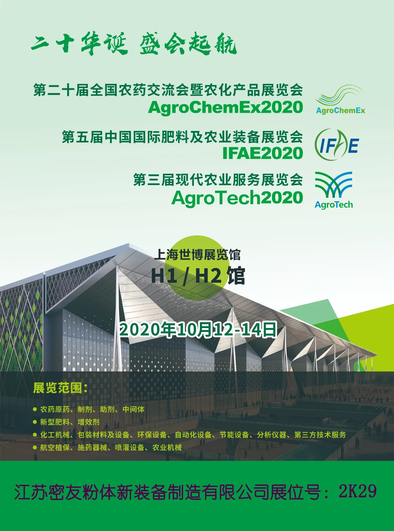 全球农化行业年度盛会,“第二十届全国农药交流会暨农化产品展览会、第五届中国国际肥料及农业装备展览会、现代农业服务展览会”将于10月12-14日在上海世博馆隆重举办。江苏密友粉体新装备制造有限公司与600多家农化行业企业一道齐聚上海,共襄盛会。