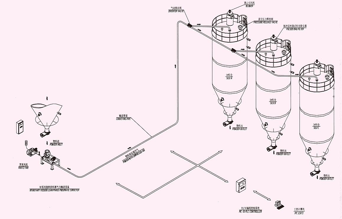 正压稀相气力输送系统是采用罗茨风机或者罗茨空压泵作为动力源。利用空气动能作为输送介质,物料以较高的速度并以分散悬浮的状态在管道中传输。输送的压力一般根据工况条件不同可在几千帕到几百千帕范围内调整。