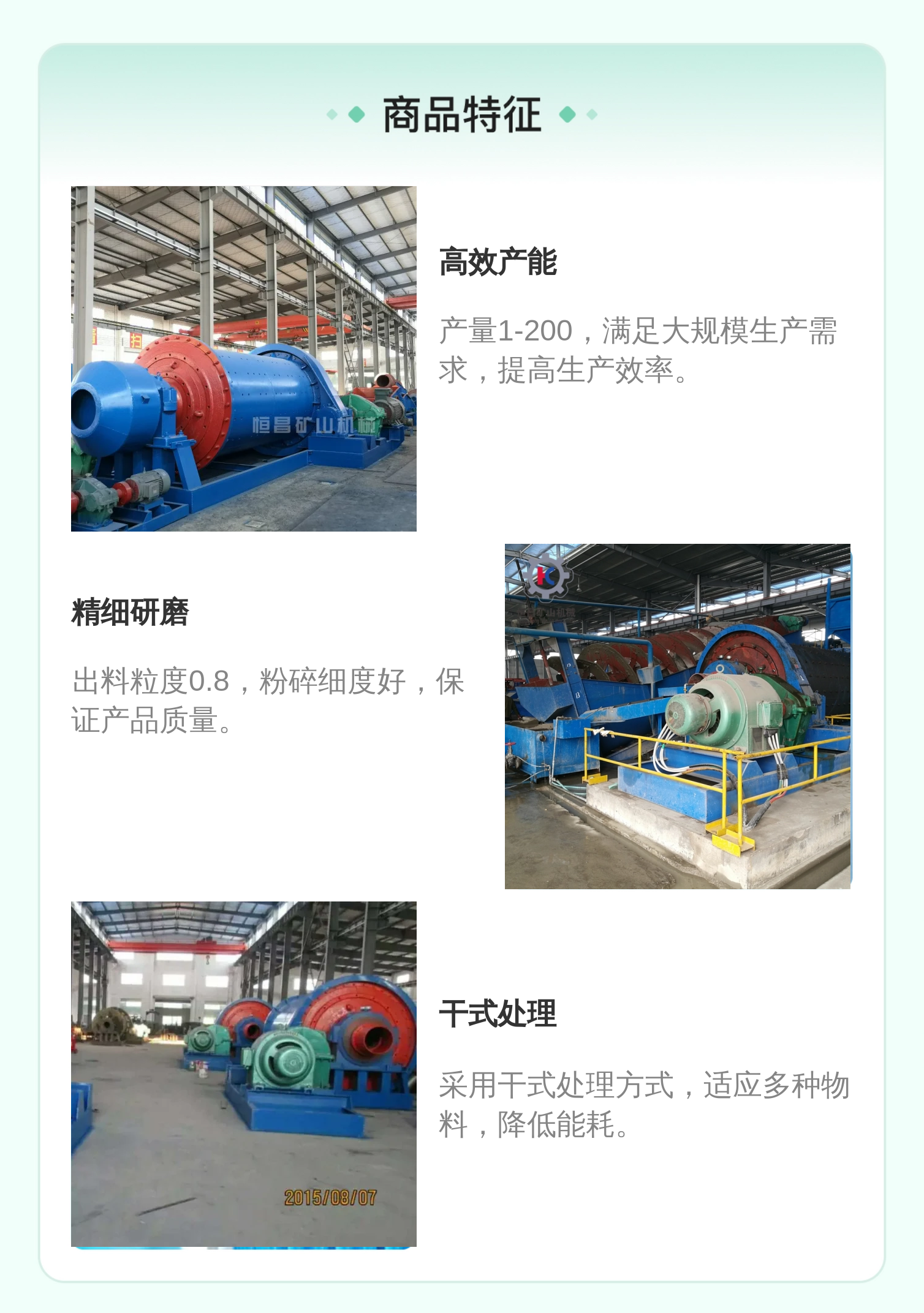 球磨机、螺旋分级机、跳汰机、选矿摇床、振动筛、搅拌桶、浮选机、破碎机
