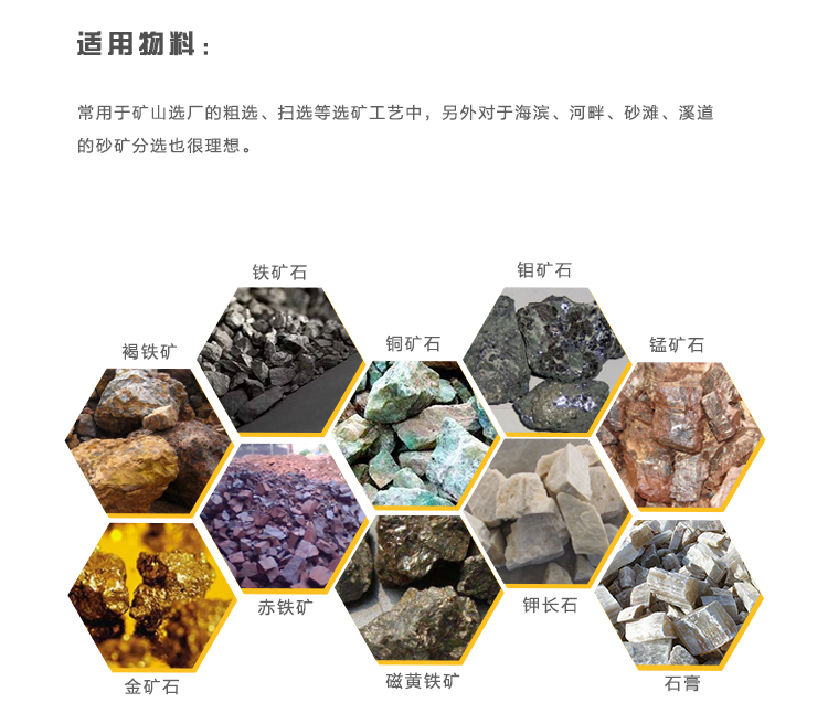 球磨机、螺旋分级机、跳汰机、选矿摇床、振动筛、搅拌桶、浮选机、破碎机