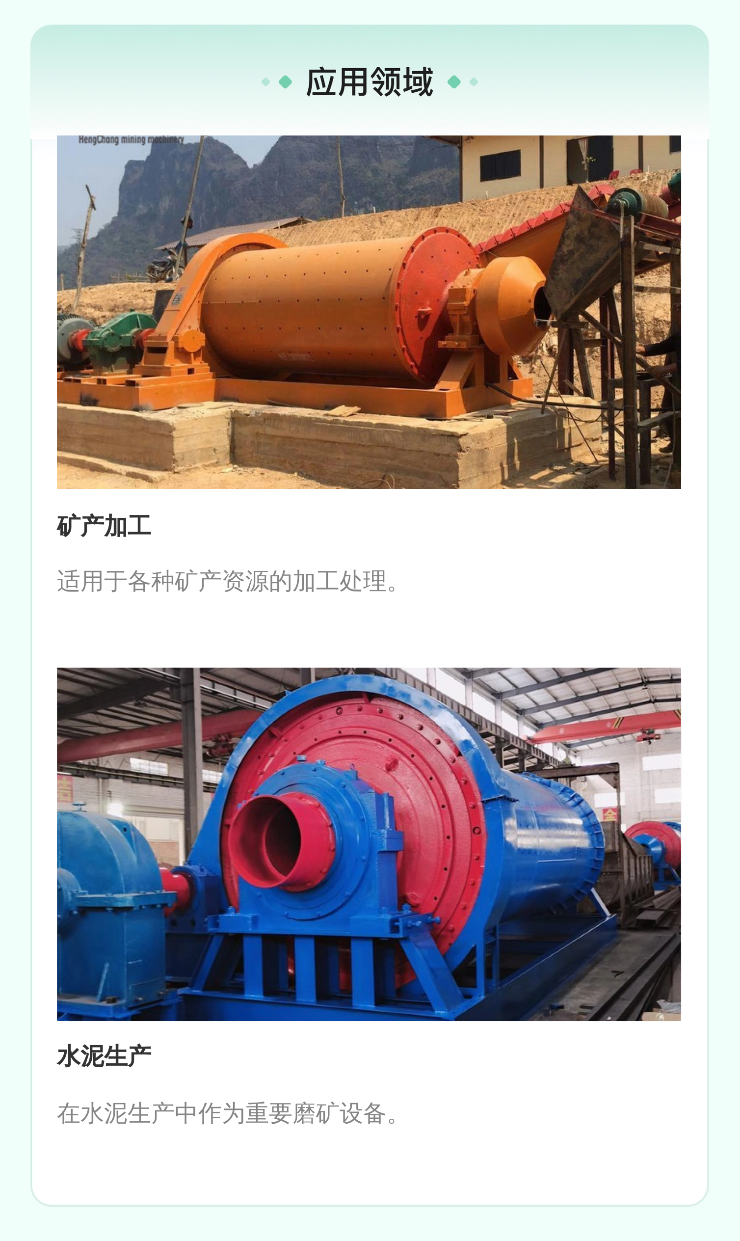 球磨机、螺旋分级机、跳汰机、选矿摇床、振动筛、搅拌桶、浮选机、破碎机