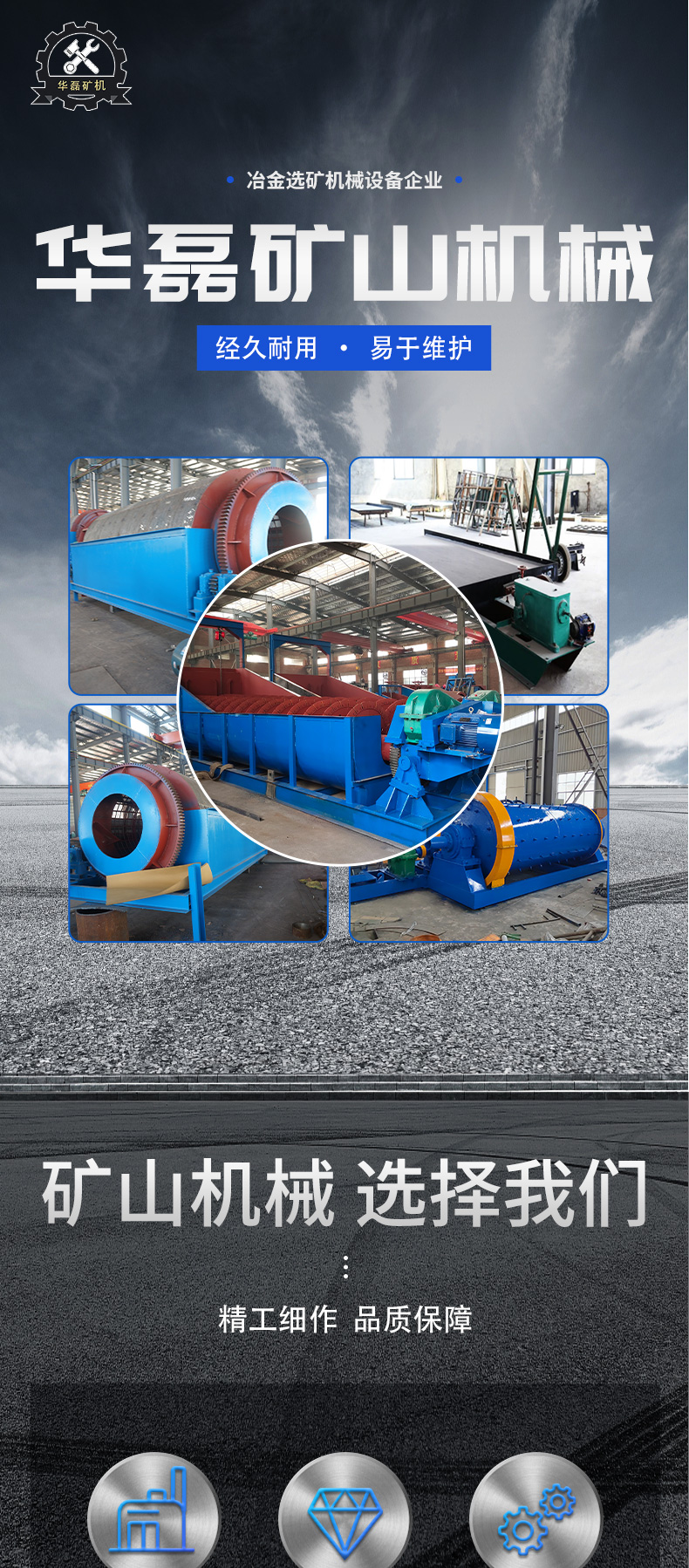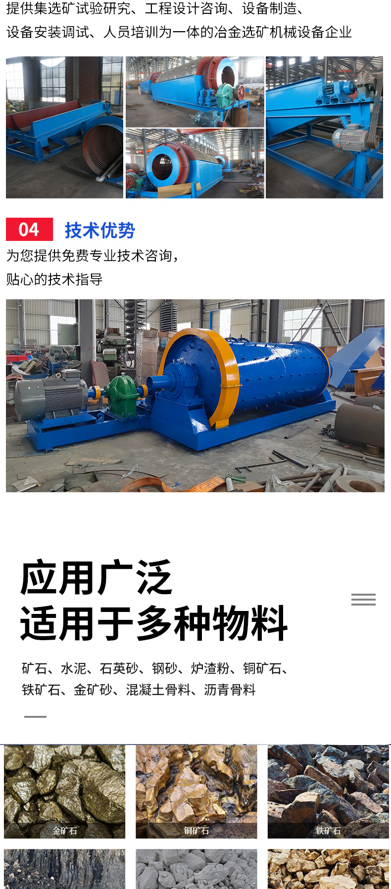 选矿摇床、螺旋溜槽、跳汰机、螺旋分级机、滚筒筛、圆筒洗矿机、浮选机、球磨机、振动筛、水力旋流器、浓密机、洗砂设备、矿用搅拌桶、给矿机、鄂式破机、磁选机、选矿设备、矿山设备、对辊破机、锤式破机、立式破机、浮选设备、重选设备、稀土选矿设备、离心选矿设备