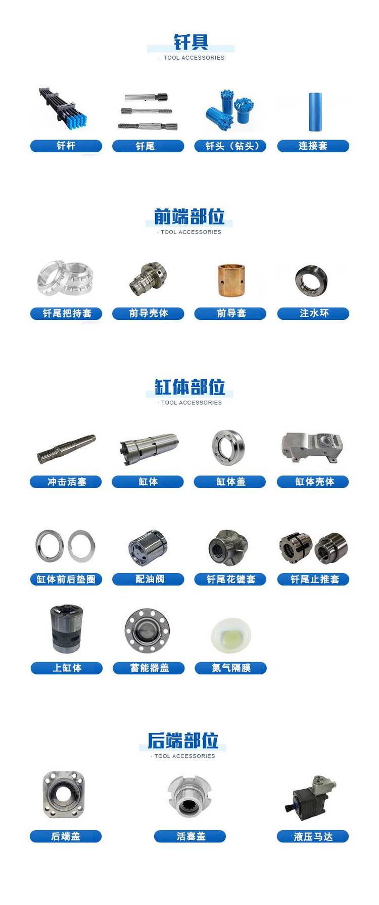 连接板、凿岩机、传动轴、轴承套、缓冲套、梅花扳手、缓冲衬套、液压马达、缓冲活塞、套筒转接头、高低压蓄能器、液压锚杆钻车、掘进凿岩台车、冲击活塞止动环、蓄能器拆装工具、岩机配件活塞盖