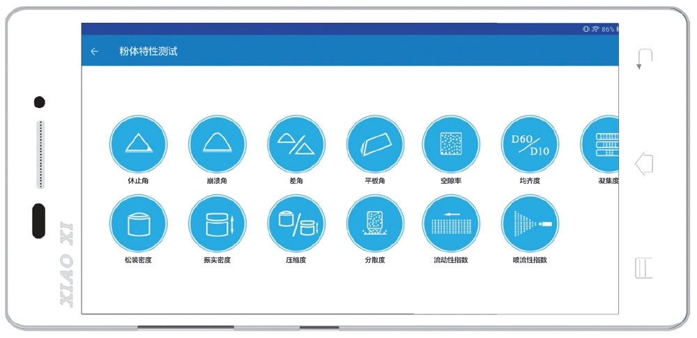 | 测试项目(共14项) | 休止角、崩溃角、平板角、分散度、振实密度、松装密度、筛分粒度、差角、压缩度、空隙率、 凝集度、均齐度、流动性指数、喷流性指数 |