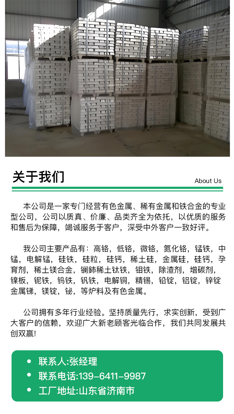 添加剂、金属锑、金属材料、高纯镁锭、高性能镍板、电解金属锰、铁金属合金、硼铁、铝粒、铝锭、金属锑、金属锰、钼铁、纯铁、低铬、电解铜、金属铬、镍板、金川镍板、金属钴