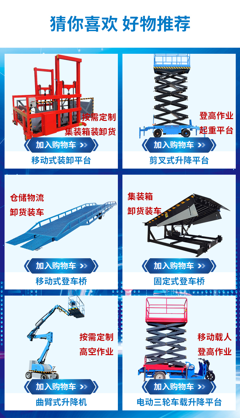 导轨式升降货梯、液压登车桥、液压升降机、无障碍升降平台、家用电梯、装车平台