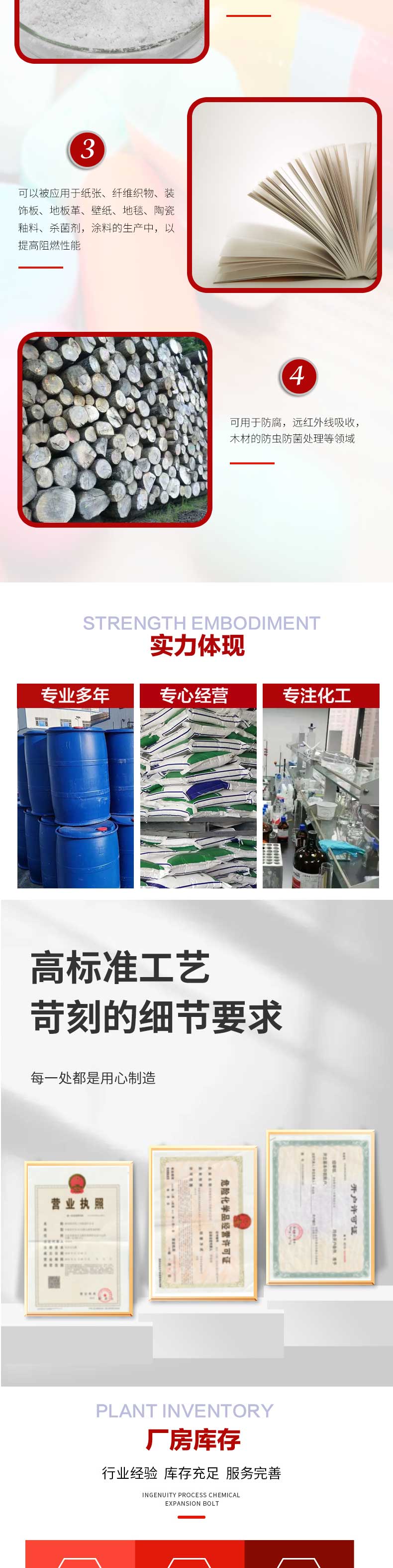 处理剂、消毒剂、二甲苯、还原剂、增湿剂、乳化剂、防腐剂、锌氯粉、氟化铵、干燥剂、吸附剂、漂白剂、杀虫剂、氟化钠、拔染剂、甜味剂、氧化镍、缓蚀剂、融雪剂、防冻液、氟化氢、氯化铵、丙二醇、分析纯、火碱烧碱