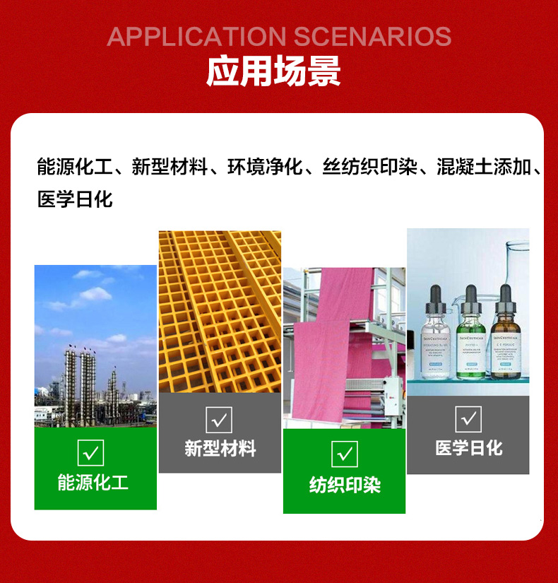 处理剂、消毒剂、二甲苯、还原剂、增湿剂、乳化剂、防腐剂、锌氯粉、氟化铵、干燥剂、吸附剂、漂白剂、杀虫剂、氟化钠、拔染剂、甜味剂、氧化镍、缓蚀剂、融雪剂、防冻液、氟化氢、氯化铵、丙二醇、分析纯、火碱烧碱