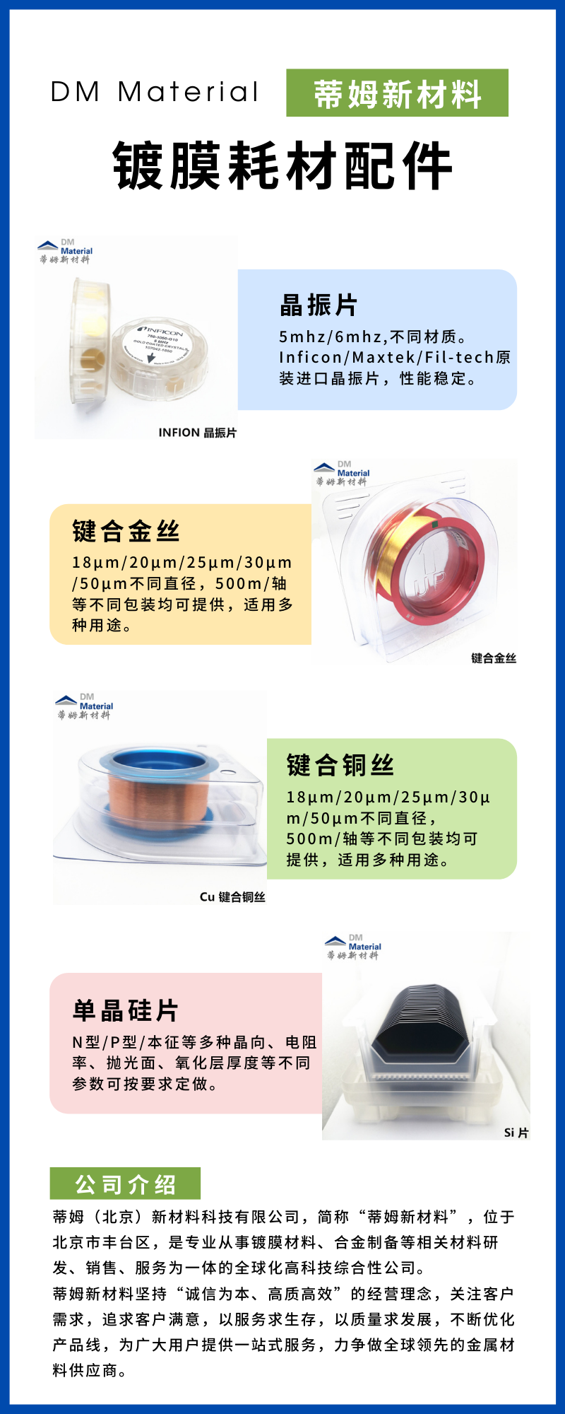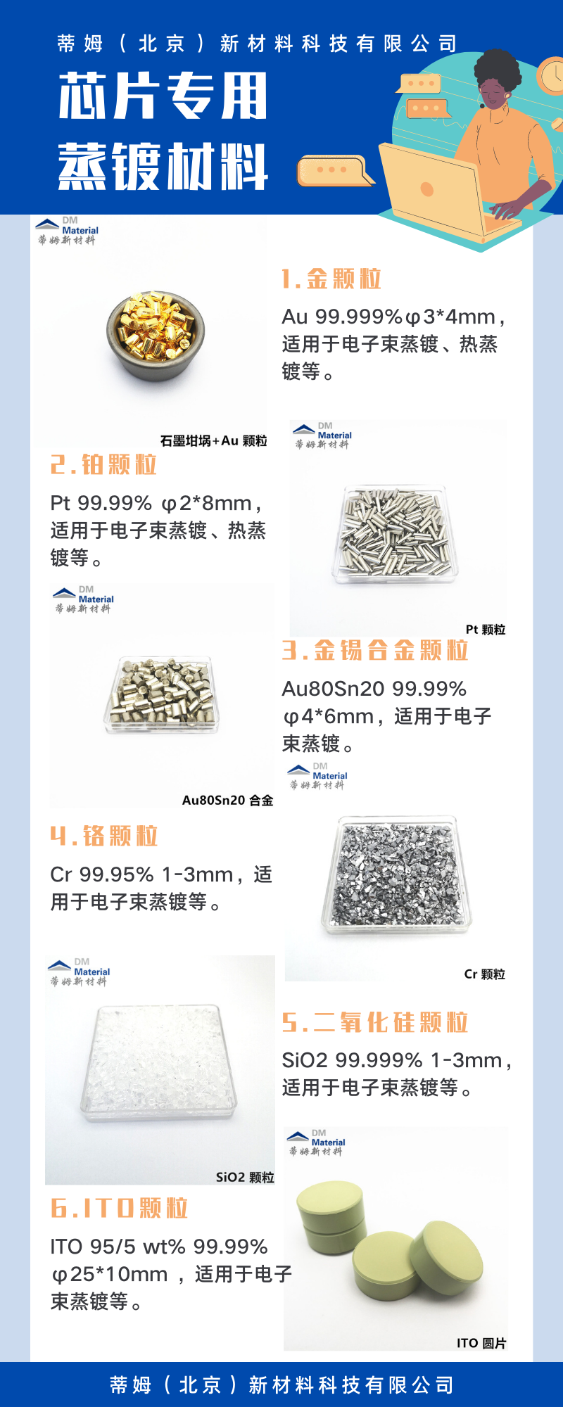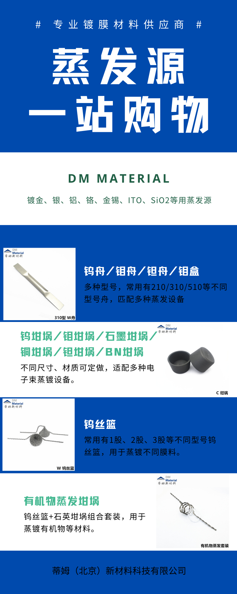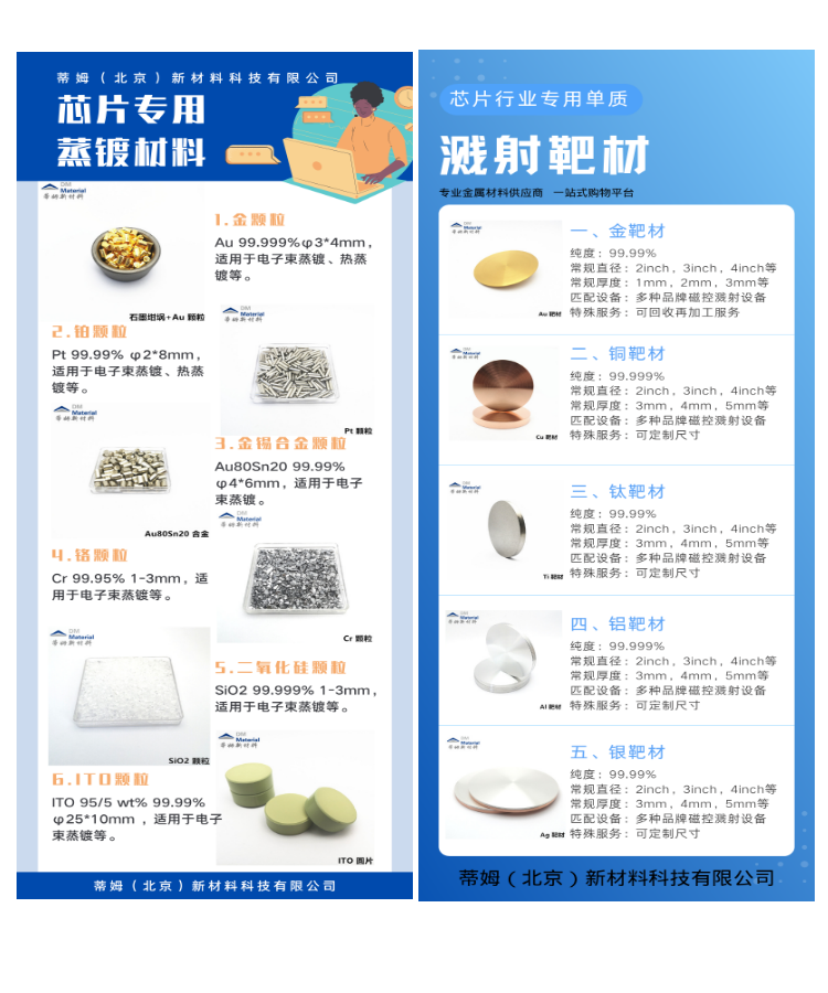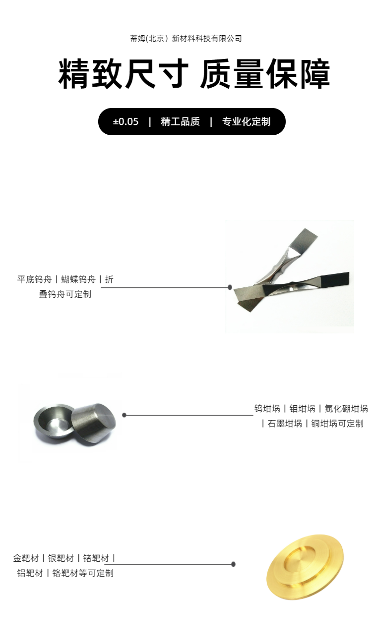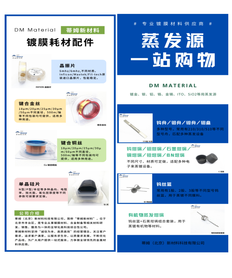 蒸发镀膜材料;光学镀膜材料;氧化硅颗粒;陶瓷化合物;金属单质块材;蒸镀颗粒;钨舟钼舟钨丝篮;贵金属蒸发料;金颗粒铂颗粒钯颗粒银颗粒;硫化锌颗粒硒化锌颗粒锗颗粒氧化铪颗粒;氧化钛颗粒氧化铝颗粒氧化锌颗粒
