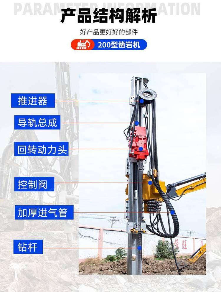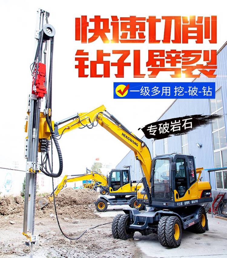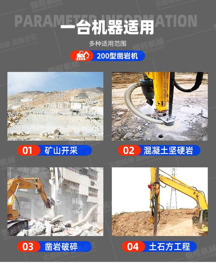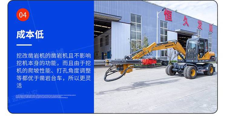 挖改凿岩机,是用来直接开采石料的工具。它在岩层上钻凿出炮眼,以便放入炸药去炸开岩石,从而完成开采石料或其它石方工程。此外,凿岩机也可改作破坏器,用来破混凝土之类的坚硬层。挖改凿岩机是按冲击破原理进行工作的。工作时活塞做高频往复运动,不断地冲击钎尾。在冲击力的作用下,呈尖楔状的钎头将岩石压并凿入一定的深度,形成一道凹痕。活塞退回后,钎子转过一定角度,活塞向前运动,再次冲击钎尾时,又形成一道新的凹痕。两道凹痕之间的扇形岩块被由钎头上产生的水平分力剪。活塞不断地冲击钎尾,并从钎子的中心孔连续地输入压缩空气或压力水,将岩渣排出孔外,即形成一定深度的圆形钻孔。