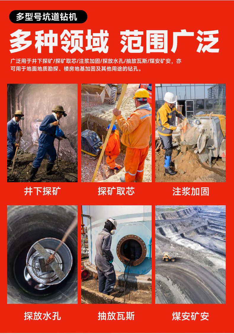 光伏打桩机、挖掘机、潜孔钻机、液压钻机、护栏打桩机、推土机、坑道钻机、气动打井机、挖改钻机、反循环钻机、水气两用钻机、绳索取芯钻机、平地机、两头忙
