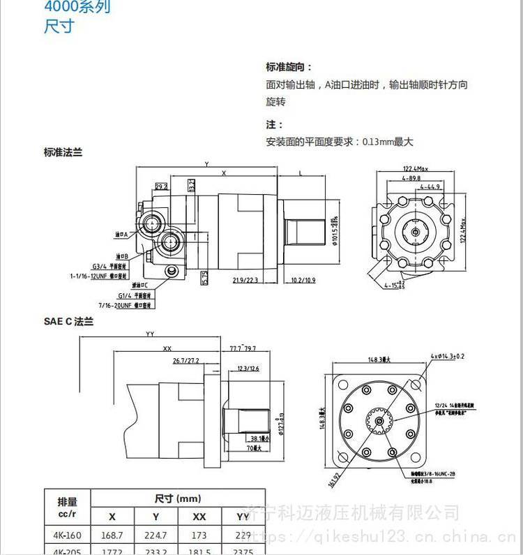 详细信息 4K系列 ·端面配流式摆线液压马达 · 的镶柱式定转子参数设计,启动压力低, ,低速运转 平稳 · 的轴密封设计,高的背压承受能力 · 可靠的联动轴设计,使马达具有长寿命 · 的配流机构设计,具有配流精度高和磨损自动补偿的特点 ·马达允许串联和并联使用,串联使用时应接外泄油管 ·采用圆锥滚子轴承支撑设计,具有较大的径向承载能力,使得马达 可直接驱动工作机构 ·多种法兰、输出轴、油口等安装连接形式