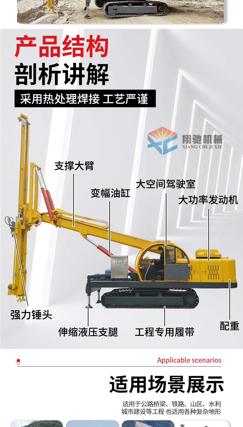 光伏打桩机、护坡锚杆钻机、潜孔钻机、护栏打桩机、隧道钻机、履带式运输车、螺旋钻机、取芯钻机、水井钻机、蜘蛛吊、管棚钻机、支护钻机、抗浮锚杆钻机、地基打桩机、吊改钻、电动叉车、发电车、履带底盘、旋挖钻机、水井钻机、照明车、静压桩光伏振动锤、光伏板安装车