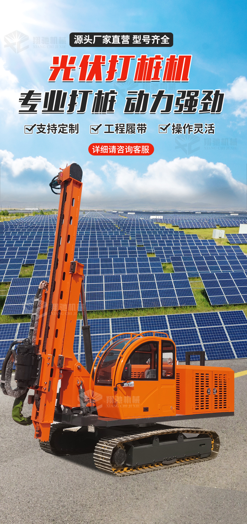 光伏打桩机、护坡锚杆钻机、潜孔钻机、护栏打桩机、隧道钻机、履带式运输车、螺旋钻机、取芯钻机、水井钻机、蜘蛛吊、管棚钻机、支护钻机、抗浮锚杆钻机、地基打桩机、吊改钻、电动叉车、发电车、履带底盘、旋挖钻机、水井钻机、照明车、静压桩光伏振动锤、光伏板安装车