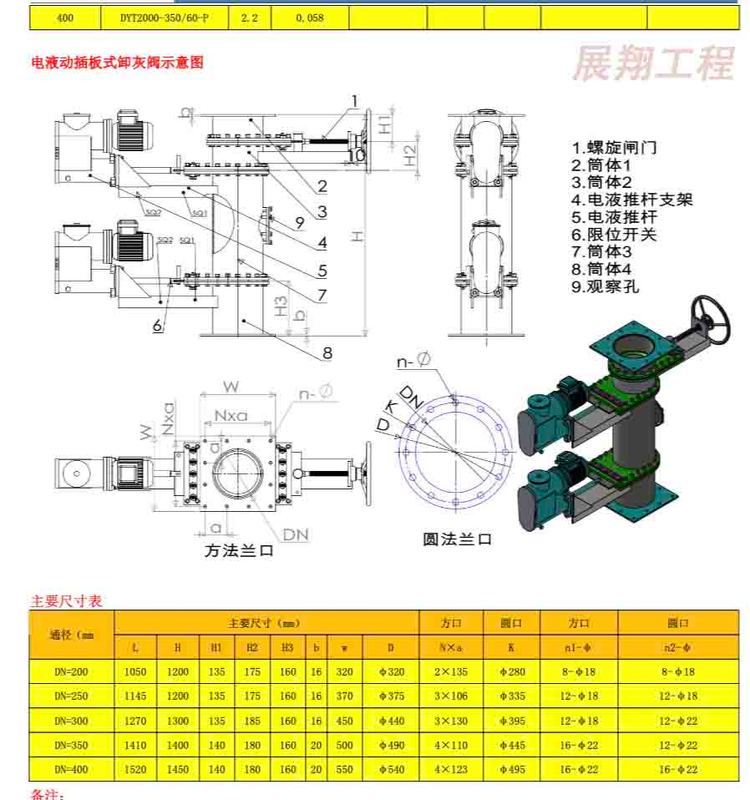 电液推杆与电动推杆、电动执行机构、液压缸、气缸相比,有如下优点:1、具有可靠的过载自动保护性能,即使超负荷或运行至行程终点时,电机照样可正常运转,却不会烧毁损坏其它机件。电动推杆和电动执行机构 则无法可比。2、电液推杆可以带负荷启动,而电动推杆和电动执行机构很困难。3、同一台电液推杆在其额定的推、拉力范围内,其推、拉力可无级调节,因而具有驱动力 ,而电动推杆和气缸则无法办到。4、在推力和速度相同的情况下,电液推杆消耗的电能是电动推杆和电动执行机构的一半。5、电液推杆采用全液压传动,动作灵敏,运行平稳,能有效减缓外来的冲击力,行程控制,气缸、电动推杆和电动执行机构则不能做到。6、电液推杆采用机、电、液一体化全封闭结构,工作油路循环于无压的封闭钢筒里,体积小、不漏油,便于安装维修。在恶劣的环境下不吸尘、不进水、内部不锈蚀,使用寿命比气缸、电动推杆、电动执行机构长久。7、投资小。气缸需建昂贵的空压站,气压管路易泄漏,气压不稳定,噪音高;液压缸需建液压站,而电液推杆只需接通电源即可使用。8、维修方便。在特殊情况下,电液推杆只需更换即可,而液压缸则需先慢慢查明故障原因,再进行仔细地维修,这就影响了全部工作的正常运行。造型说明电液推杆主要是由推杆的型式、电机的防护等级、额定输出力、行程、额定速度和使用角度等六大基本要素组成,还可根据用户特殊要求,配套三种调节功能,即:速度调节、推拉力调节,行程调节(行程开关)。除了上述三种调节功能订货时必须文字注明外,其它请参照型号编制方式认真填写六大基本要素。以下举“DYTZB1000-500/50-X型电液推杆”为例,分别说明选型和型号编制的方式。选型:某一场所需要一台整体直式的电液推杆,要求电机防爆,其推力10kn,行程500mm速度110mm/s,使用角度向下推,那么所选电液推杆的标准型号为:DYTZB1000-500/50-X.(B为防爆标记,X表示向下推)DYTZW(Ⅱ)整体直式微型电液推杆技术参数(选型表)型号(Ⅱ) 额定输出力(10N) 额定速度(mm/s) 电机型号 行程制造范围(mm) 速度制造范围(mm/s)推力 拉力 推速 拉速DYTZWⅡ100-/160 100 70 160 200 Y802-4-0.75KW 50-600 80-160DYTZWⅡ300-/120 300 210 120 180 Y802-4-0.75KW 50-600 40-120DYTZWⅡ500-/120 500 350 120 180 Y90S-4-1.1KW 50-600 40-120DYTZWⅡ700-/100 700 490 100 130 Y90S-4-1.1KW 50-1500 20-100DYTZWⅡ1000-/100 1000 750 100 130 Y90L-4-1.5KW 50-1500 20-100DYTZWⅡ1750-/90 1750 1300 90 115 Y100L1-4-2.2KW 50-1500 10-90DYTZWⅡ2500-/90 2500 2050 90 115 Y100L2-4-3KW 50-1500 10-90DYTZWⅡ3000-/90 3000 2500 90 115 Y100L2-4-3KW 50-1700 10-90DYTZWⅡ4000-/80 4000 2950 80 100 Y112M-4-4KW 50-1700 10-80