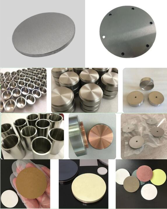 合金靶材:铝铬AlCr,铝钛AlTi,镍铬NiCr,钴铁硼CoFeB,钨钛WTi,铜镍钛CuNiTi ,铜镍CuNi,铝钪AlSc,碲锗靶材(Ge15Te85at%);镍钒NiV;镍铁NiFe,镍钛NiTi,镍钴NiCo, 镍铝NiAl, 镍铬硅NiCrSi,铁钴钽锆FeCoTaZr,铁锰铜镓FeMnCuGa; 铜铟镓CuInGa等。